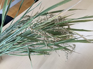 ここに、稲穂(皆さんが美味しく食べているお米です)を持ってきました。5年生が植えた稲で、稲刈りの季節を迎えました。