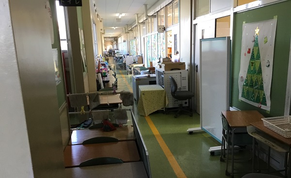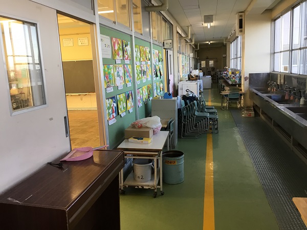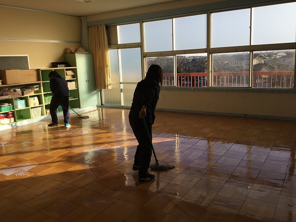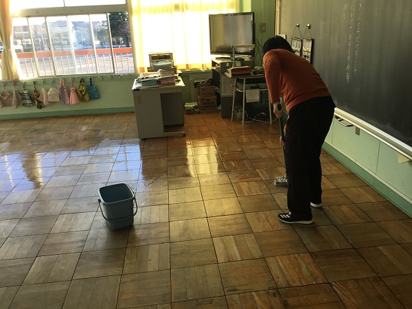 全校児童が下校すると、全職員で全教室のワックスがけです。教室の机等は子どもたちが廊下に出して下校ですが、その後は、職員で箒をかけ、各階ごとに協力してワックスをかけていきます。明日、子どもたちが登校した時には、ピカピカの教室になっています。学校の暮れの行事の一つです。子どもたちは、きっと冬休みに家の大掃除のお手伝いをするのでしょうね。