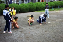 100メートル、ハードル、幅跳び、高跳び、持久走などたくさんの競技の指導をしてくれました。中には岡部小の卒業生の姿もありました。