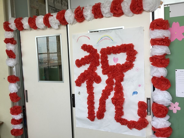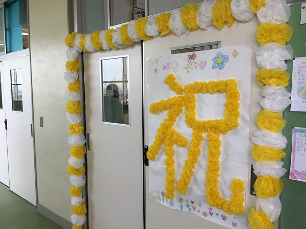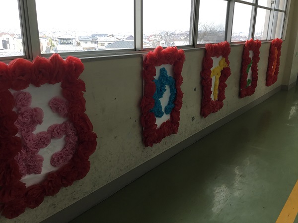 6年生の教室の廊下に2年生から卒業を祝う飾りが掲示されました。「ありがとう」と「祝」の文字が飾られました。