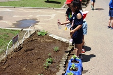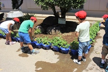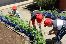 職員室前の花壇にマリーゴールドも育てているそうです。たくさん水をあげていました。アサガオは蔓が伸びてきた鉢もあり、そろそろ支柱を立てる位になっています。