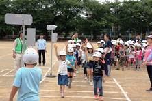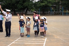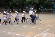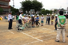 1、2年生は横断歩道の渡り方、3年生は自転車の乗り方、4年生は道路上の自転車の乗り方と交通ルールのテストをしました。1,2年生は指さし確認の声がよく出ていました。