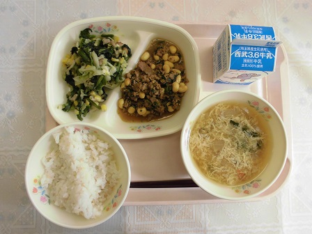 今月の給食目標は「食べ物と栄養について考えよう」です。寒い日が続きますが、栄養をしっかりとって、元気に過ごしたいものです。大豆や豚肉が入ったたんぱく質たっぷりのソイ丼はごはんの上にかけておいしくいただきました。