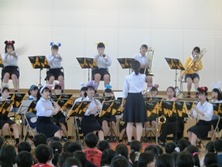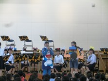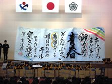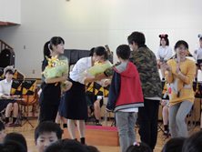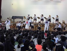 合奏はガリバー旅行記、ドラえもん、ディズニーや最近はやりのアイドルの演奏でした。特にUSAの曲の時は、児童がサビを歌っていてノリノリでした。指揮やMCも高校生が勤めていて、すべて自分たちで進行している姿に驚きました。書道パフォーマンスは曲に合わせてダンスしながら、巨大な用紙に歌詞をしたためていました。とてもきれいな字で拍手が巻き起こっていました。