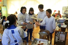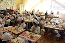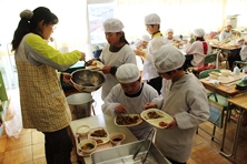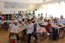 職員がおかずを回って配っているクラスもあれば、おかわり用に残っていた給食があっというまになくなってしまうクラスもありました。栄養バランスを考えて作られている給食です。みんなの成長に必要な栄養がたくさん入っています。たくさん食べて大きく元気になりましょう。