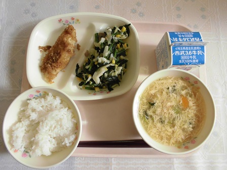 埼玉県で多く生産されているほうれん草は、夏にとれる時より3倍もの栄養が含まれているそうです。今日はソテーでおいしくいただきました。白身魚の南蛮漬けは味付けがしっかりとしていておいしかったです。スープは卵が入っていておいしかったです。