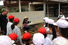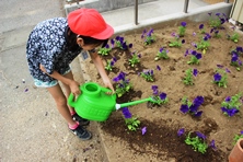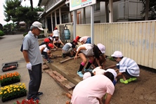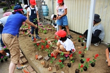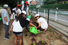 栽培委員会で考えた設計図を元にレンガを並べ、たくさんの花で飾り付けをしました。1時間という短い時間でしたが、ボランティアの方々の手際の良さで、体育館前だけでなく幹線道路沿いの花壇にもお花を植えることができました。