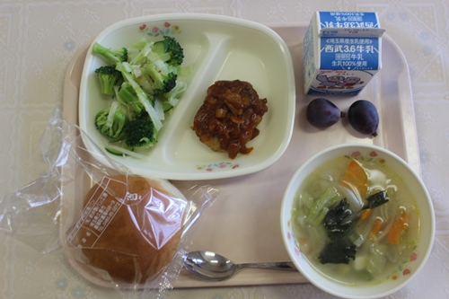今日は、ハンバーガーでした。トマトベースの甘めのソースがハンバーグに合っていておいしかったです。パンに挟んでハンバーガーにして子どもたちもおいしそうに食べていました。豆腐と野菜のスープは、具だくさんでやさしい味でおいしかったです。ぶどうは、子どもたちに人気でした。甘くてみずみずしくておいしかったです。