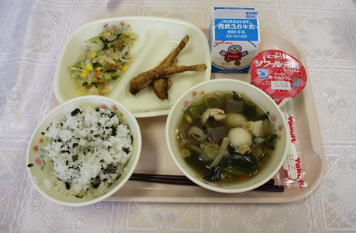 牛乳 今日は、ハタハタのから揚げとだまっこ鍋で秋田県の料理でした。ハタハタは、秋田の県魚です。白身魚でカリカリに揚がっていておいしかったです。魚が苦手な子どもも食べてみたらおいしかったと言っていました。だまっこ鍋のだまっこは、ごはんを軽く潰して丸めたものです。「玉っこ」から転じたのかとおもいきや、向こうの言葉で「丸める」という意味の「だまける」からきたという説や「お手玉」をあらわす秋田言葉「だまこ」からきているとする説もあるようです。炊いたごはんを潰して秋田杉の棒につけて焼くのが本来のきりたんぽなのですが、丸めただけのものを入れたのを「だまっこ鍋」といいます。だまっこがたくさん入っていて、もちもちしていてやわらかくておいしかったです。子どもたちもおいしそうに食べていました。