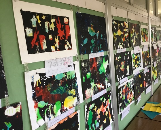 2年生の廊下の作品が、楽しい作品にかわっていました。型紙を作って、ローラーで重ね塗りをしたものです。多色塗り版画のようです。