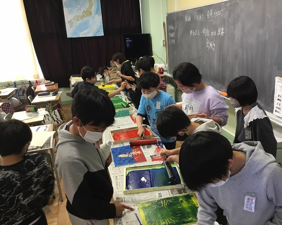 4年生の教室をのぞいてみると、4年生は、多色塗りの木版画をしていました。4年生は、彫刻刀で板を彫っていきます。まだ途中ですが、仕上がるのが楽しみです。