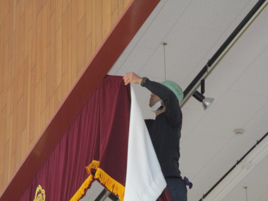 11月15日(火)朝から業者の方が、体育館の緞帳を新しくする工事を行ってくれました。