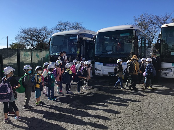今日は、1,2年生の生活科見学です。秋晴れの青空の中、1,2年生全員元気よくバスに乗り込み、出発しました。目的地は、埼玉県こども動物自然公園です。コアラやペンギン、キリンなどの動物や秋色にかわってきている木々をみたりして、楽しんくると思います。
