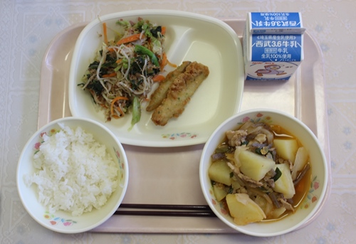 今日は、じゃが豚キムチでした。肉じゃがにキムチを入れることで甘じょっぱい中にキムチの辛さが混ざっていてピリ辛でおいしかったです。じゃがいもがホクホクで、よく味が染みていてごはんが進みました。プール開きもあり、暑い一日でしたが食欲の出るメニューでした。みんな、もりもり食べていました。