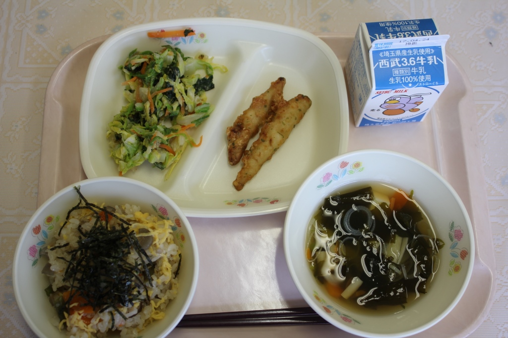 今日は、五目寿司でした。たくさんの具が入っていて食感が様々でおいしかったです。わかさぎフリッターと若竹汁は、季節の献立でした。たけのこやわかさぎなど春を感じられる食材が入っていて、季節が感じられておいしかったです。