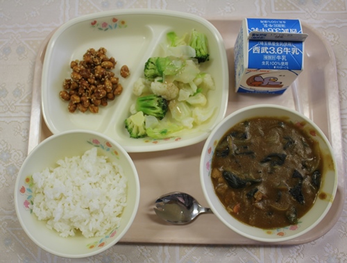 牛乳 今日は、小江戸カレーでした。小江戸カレーとは、江戸の風情を残す街並みを残した「小江戸」とよばれる川越市の産物「さつまいも」と川越市をはじめ埼玉県で生産量の多い「ほうれん草」の入ったカレーのことです。子どもたちの大好きなカレーの日なので、もりもり食べていました。おかわりをしている子どももたくさんいて残りがなかったです。大豆のシャリシャリ揚げは、甘めの味付けで子どもたちにも人気でした。明日は、運動会です。たくさん食べて元気いっぱいがんばりましょう。