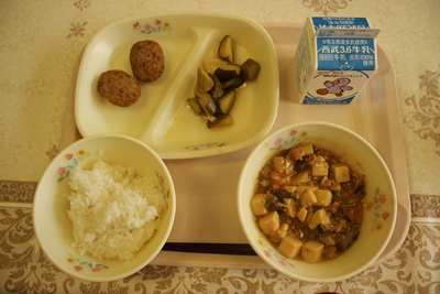 今日は、マーボーなす豆腐でした。いつものマーボー豆腐に、いまが旬のなすを入れました。ごはんにかけて、丼にしている子もいました。みんなしっかり食べていました。