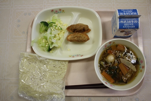 今日は、広東めんでした。にんじん、たけのこ、きくらげなど具だくさんで食感もいろいろあっておいしかったです。とろみのあるスープで、めんとよく絡まって食べやすかったです。チーズサラダは、チーズがいいアクセントになっていておいしかったです。みんな、おいしそうに食べていました。
