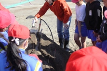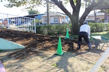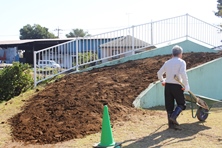 校庭の東側にある斜走路がまさに、この出前授業の通りに、雨や風のために土が流され続けたために土台のコンクリートがでてきてしまいました。そこで、用務員さんにお願いして、土をたくさん入れてもらいました。5年生にも手伝ってもらい、安全な斜走路に戻りました。