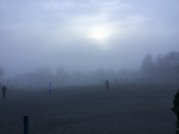 今朝の学校は霧に包まれていました。子どもたちが登校を始めると、校庭にどんどん霧が出てきました。子どもたちは、霧の中で「おいかけっこ」をしたいとみんな元気に橋まわっていました。朝の始業のチャイムがなり、子どもたちが教室に入ると校庭の霧も消えました。