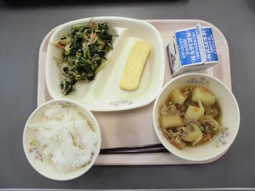 今日は、肉じゃがでした。じゃがいもが柔らかくて具材によく味が染みていておいしかったです。ごはんによく合っていて、みんなもりもり食べていました。磯の香あえのほうれん草は深谷市園芸協会の人たちが心をこめて作ってくれたものです。ほうれん草は、ビタミンや鉄分が豊富に含まれていて、元気いっぱいのスタミナ野菜と言われています。これからもたくさん食べて元気にすごしましょう。