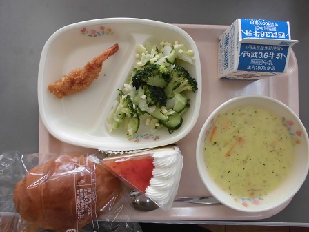 今日は2学期の給食最後でした。エビフライやコーンスープをおいしくいただきました。サラダもブロッコリーやきゅうりがたっぷりでチーズも入っておいしかったです。おたのしみデザートは大きくてクリームがたっぷりのケーキでした。明日からは給食がありませんが、栄養をとって、風邪をひかないよう、元気にお過ごしください。どうぞ、よいお年をお迎えください。