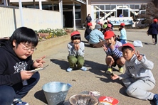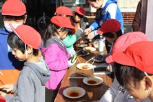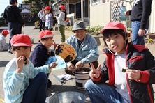 昔といっても七輪は今もホームセンターで販売されていますが、使ったことがない児童が多くいました。11名のボランティアの方にお手伝いいただき炭に火をつけ餅を焼きました。児童に聞くと、家で食べるもちと全然違う、もっと食べたいと話してくれました。