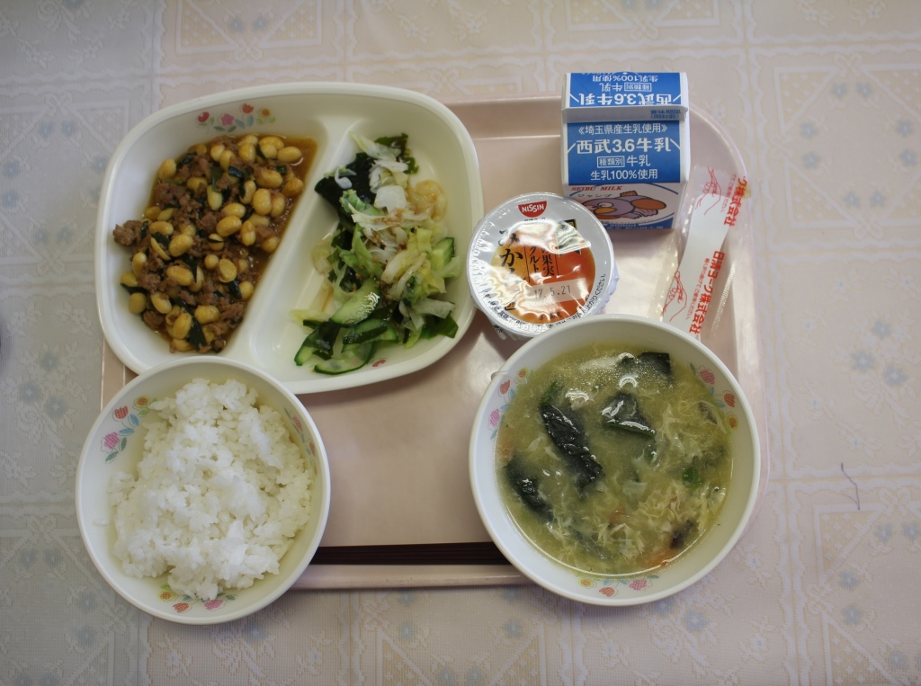 今日は、ソイ丼でした。大豆がたっぷり入っていてカレー風味の味付けでごはんとの相性もよくておいしかったです。レンファータンは、新献立でした。中華風のかき玉スープでとろとろしていてやさしい味のスープで癒されるおいしさでした。連休明けの給食でしたが、みんなもりもり食べていました。