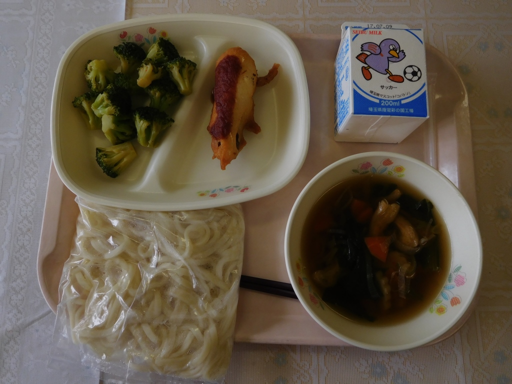 今日はごもくうどんでした。鶏肉や油あげ、にんじん、こまつな、長ネギなどたくさんの具が入っていて、栄養満点でした。アメリカンドッグは皮までおいしくて、残さず食べられていました。