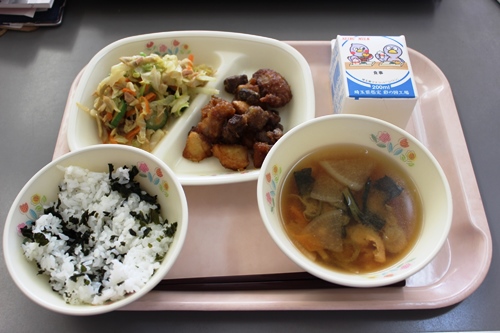 今日は、わかめごはんでした。子どもたちに人気の献立でみんなもりもり食べていました。おかわりをしている子もたくさんいました。豚肉とレバーのごまだれは、ポテトと豚肉、レバーが揚げてあってごま風味でおいしかったです。ヘルシーサラダは、きゃべつやきゅうり、にんじんがドレッシングであえてあっておいしかったです。