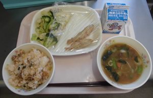 今日の給食では、キムタクご飯が出ました。キムタクご飯とは、文字通り「キムチ」と「たくあん」が入った混ぜご飯です。豚肉やこねぎも入っていておいしく食べることができました。