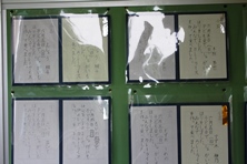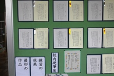 ある学年では最初に書いた作品と最後に書いた作品が並んで展示されています。練習して成長した児童の文字を比較できるようになっています。学校にお越しの際は是非ごらんいただければと思います。