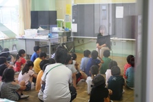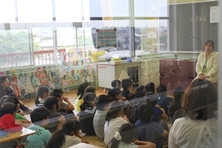 読み聞かせの空気を大事にしたいということで、少々写真が不鮮明ですが、児童や職員も読み手のお話にとても集中していました。また、挿絵も持たずに語りだけでお話をしていました。各クラス1時間、本の世界にひたらせていただきました。どうもありがとうございました。