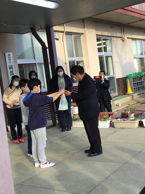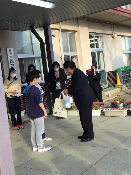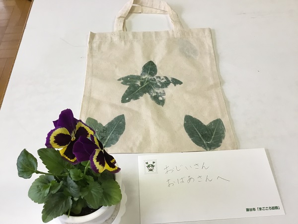 今日は、地域のお年寄りに、お花と、手紙、そして、藍のたたき染めバックを民生委員さんに届けていただくための引き渡しの会を行いました。5年生の児童が植え替えをしたビオラの鉢花と心を込めて書いた手紙に今年は、3年生が育てた藍使い、5年生が生葉のたたき染めバックを作りました。健康に気をつけて過ごしていただければという願いを込めて作成しまいた。民生委員の皆様よろしくお願いします。