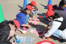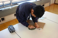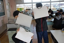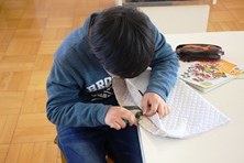卒業制作として、校庭の遊具やゴミ箱などのペンキ塗りを行い、また、家庭科の授業では、パソコン教室のタブレットを入れる袋を作りました。