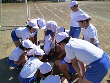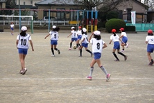 体育の授業では1組2組合同で授業をしています。チームで活発に作戦を考え必勝目指してがんばっているようです。