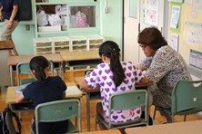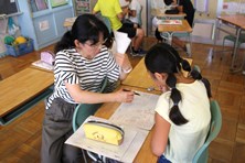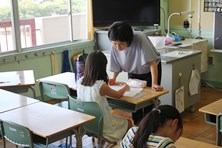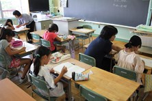 一つの学年に2~3人の職員が入って、1学期の勉強の復習をしています。算数を中心にプリントをたくさん解いています。どの児童も集中してがんばっています。