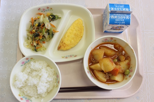今日は、肉じゃがのトマト煮でした。トマトは、旬の野菜で豊富なビタミン類や水分が含まれています。トマトで煮込んである肉じゃがでこくがありおいしかったです。子どもたちにも、いつもと少し違う肉じゃがで人気があり、みんなもりもり食べていました。7月の給食目標は、夏の食事について知ろうです。熱中症や夏バテを防ぐには、食生活が重要です。冷たい物のとり過ぎに気をつけて、こまめな水分補給を行い、栄養バランスのよい食事をとるように心がけましょう。