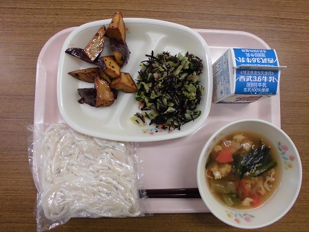 大学芋は甘くてごまが効いていておいしかったです。うどんは具沢山の汁でおいしかったです。栄養たっぷりのひじきのサラダは、さっぱりとしていて、ツナがアクセントになっていておいしかったです。