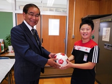 児童会長が代表として受け取りました。体育の授業、クラスのボールとして使わせていただきます。毎年どうもありがとうございます。