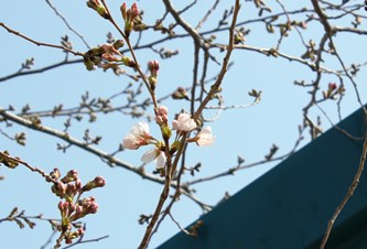 6年生が卒業するのを待っていたかのように、岡部小の桜が開花しました。