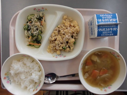 そぼろは、味付けがしっかりとしていて、ごはんと混ぜて食べると大変おいしくて食が進みました。サラダは、野菜がしゃきしゃきとしていておいしかったです。豚汁は温かくておいしかったです。