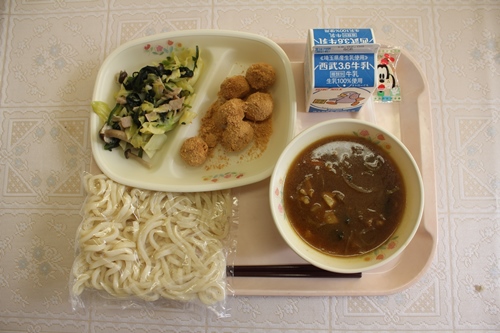 今日は、カレーうどんでした。カレースープがまろやかでうどんとよく絡んでおいしかったです。カレーうどんは、人気がある献立でスープまできれいに食べている子が多かったです。白玉団子のきなこあえは、やわらかい団子にきなこがたっぷりかかっていておいしかったです。おかわりしている子もたくさんいました。