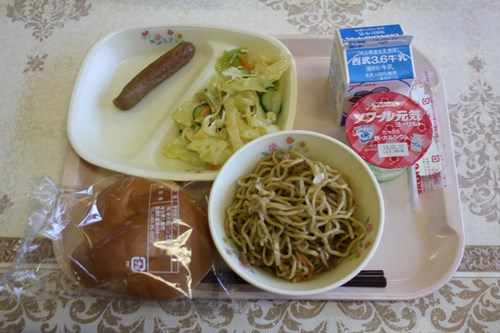 今日は、ソース焼きそばでした。給食の焼きそばは、めんを一度蒸してから炒めます。大量のめんをほぐすのには、欠かせないひと手間です。みんな、「おいしい」といってたべていました。キャベツのサラダには、春キャベツを使いました。春キャベツは、やわらかく、あまみがありおいしいです。