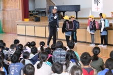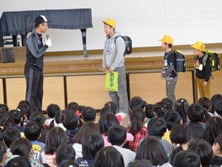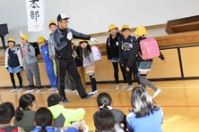 体育館では不審者が近寄ってきたらどう行動したらいいかを代表の児童を相手に教えていただきました。とにかく変だなと感じたら近づかないことが一番です。今日教わったことをしっかり守って登下校しましょう。