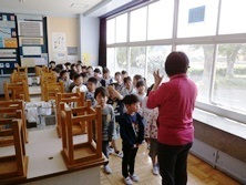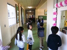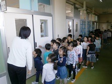 学校探検はいろいろな教室に興味津々で見学をしていました。移動しているときはとても静かに歩き、ルールが守れています。