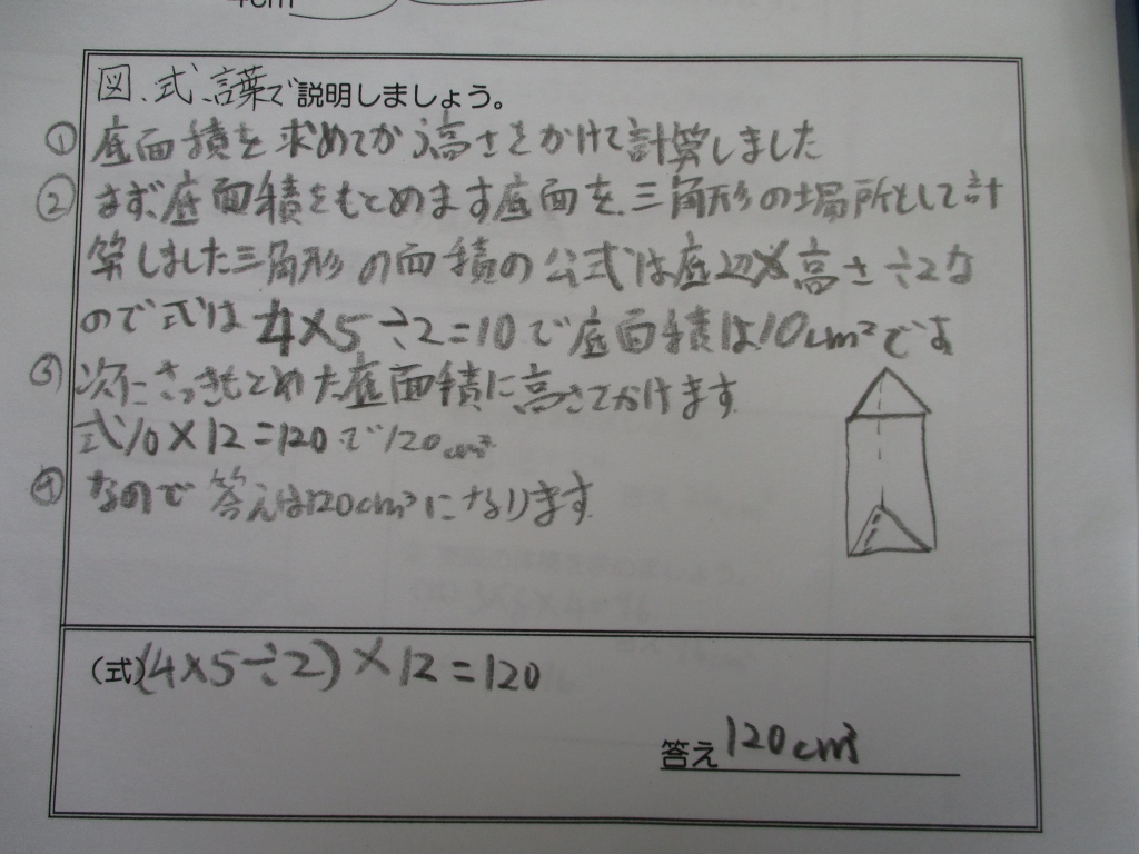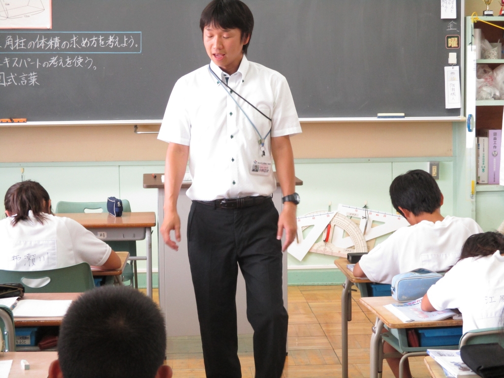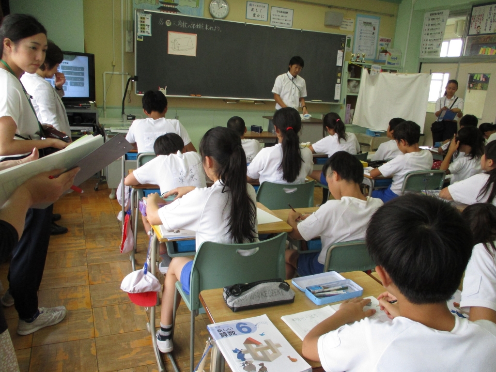 小林学級25名が三角柱の体積の求め方についてグループ学習(知識構成型ジグソー法)での話し合いを中心に授業が展開されました。2回のグループ学習で自分の考えを深め、相手に伝えることを通して、どの子も進んで学習に取り組んでいました。