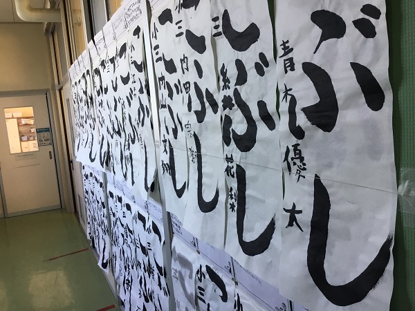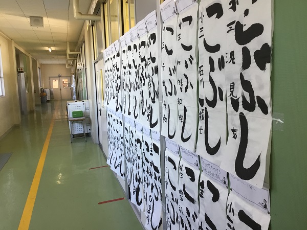 3年生の廊下ににも、書きぞめの作品が掲示されてます。3年生は、今年の4月から毛筆の学習が始まりまっした。太い筆で床で書く書きぞめは初めてです。冬休み中も家で書きぞめの練習をして、1月19日の競書会に臨みます。