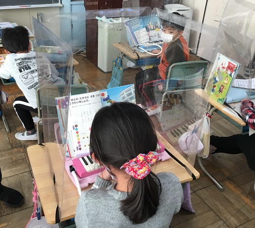 1年生は、教室で鍵盤ハーモニカのテストをしていました。教室で音楽の学習をするときは、シールドを机に設置しています。