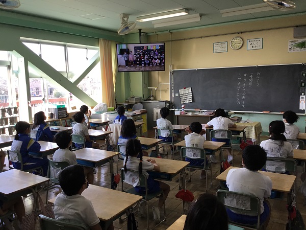 天井からつるされた大きなモニターが教室に入りました。今朝は、6年生の卒業を祝う週間の2日目です。2年生と3年生のお祝い動画を見やすい、大きな、天井からつるされたモニターで見ました。映った瞬間、子どもたちは見やすいと大喜びでした。これからも、授業中も活用していきます。